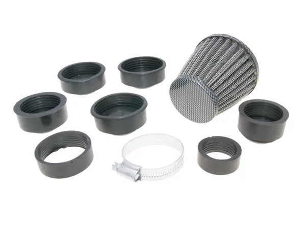Yleismallin ilmansuodatin 32-45mm kiinnityksellä. Sisältää eri kokoisia kiinnityskumeja joten soveltuu käytettäväksi useassa eri kaasuttimessa.
