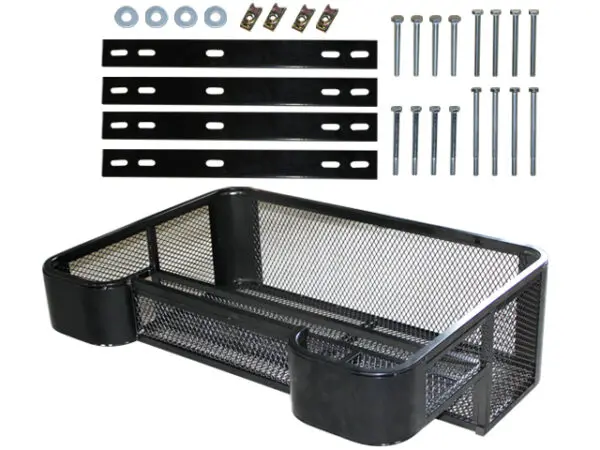 Verkkokori takana pudotustoiminnolla lisää tilaa. Sopii useimpiin mönkijöihin. Jauhemaalattua terästä, jonka sivut ja pohja ovat hienosilmäistä metalliverkkoa, vesi ja lika menevät suoraan läpi sen sijaan, että ne laskeutuisivat pohjaan ja likaisivat työkalut, ämpärit ja työkäsineet.