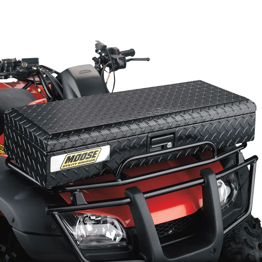 Alumiininen etutavaralaatikko mönkijään, yleismalli avainlukoilla. Mitat 81,5 cm x 32,5 cm x 16 cm.