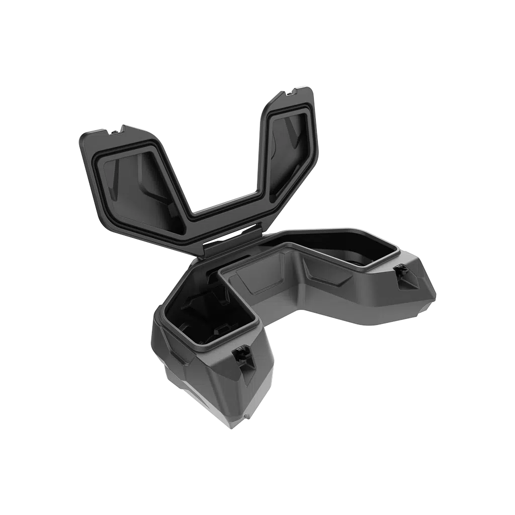 The case can be complimented with one or two 5 liter canisters. This configuration doesn’t impair the balance of the ATV and allows you to confidently maneuver and conquer routes of any complexity. Each can is mounted on the lid of the box with the quick-release fastener.