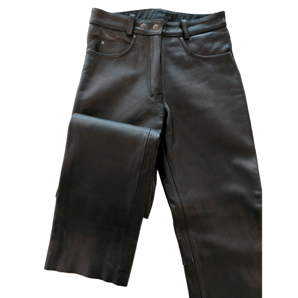 Naisten perusmallinen, musta nahkahousu hiukan kapenevalla lahkeella.