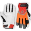 Vasemmassa käsineessä on sahaussuojus. Kämmen on valmistettu kestävästä, luonnollisesti vedenkestävästä kaksinkertaisesta vuohennahasta.