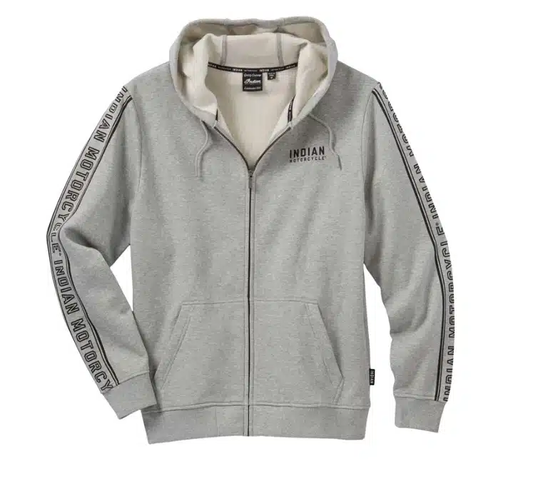 - Hihoissa Indian Motorcycle – teksti ja yksinkertainen logo edessä