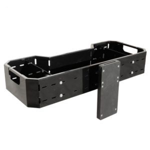 Avoin kuljetuslaatikko ja moottorisahateline. Teline pulverimaalattua terästä. Pohjalla kumimatto. Kiinnitys putkirunkoiseen tavaratelineeseen.