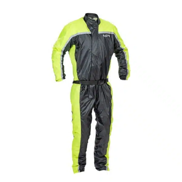 Yksiosainen polyesterisadehaalari sopii minkä tahansa ajopuvun päälle. Vyötäröllä istuvuutta parantava ja lepatusta vähentävä vyö.