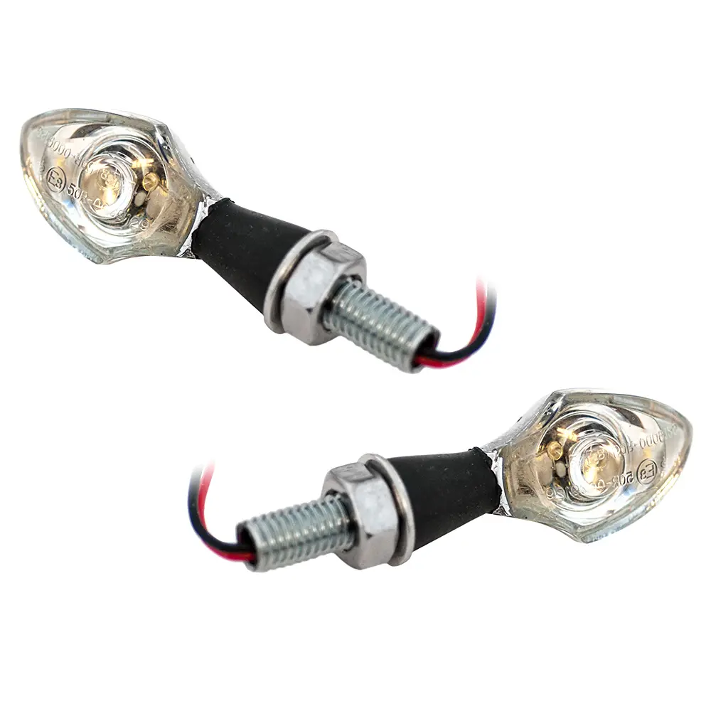 LED-minivilkut mopoon. Kromi, musta varsi, kirkas linssi.
