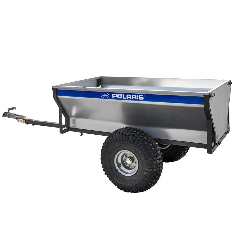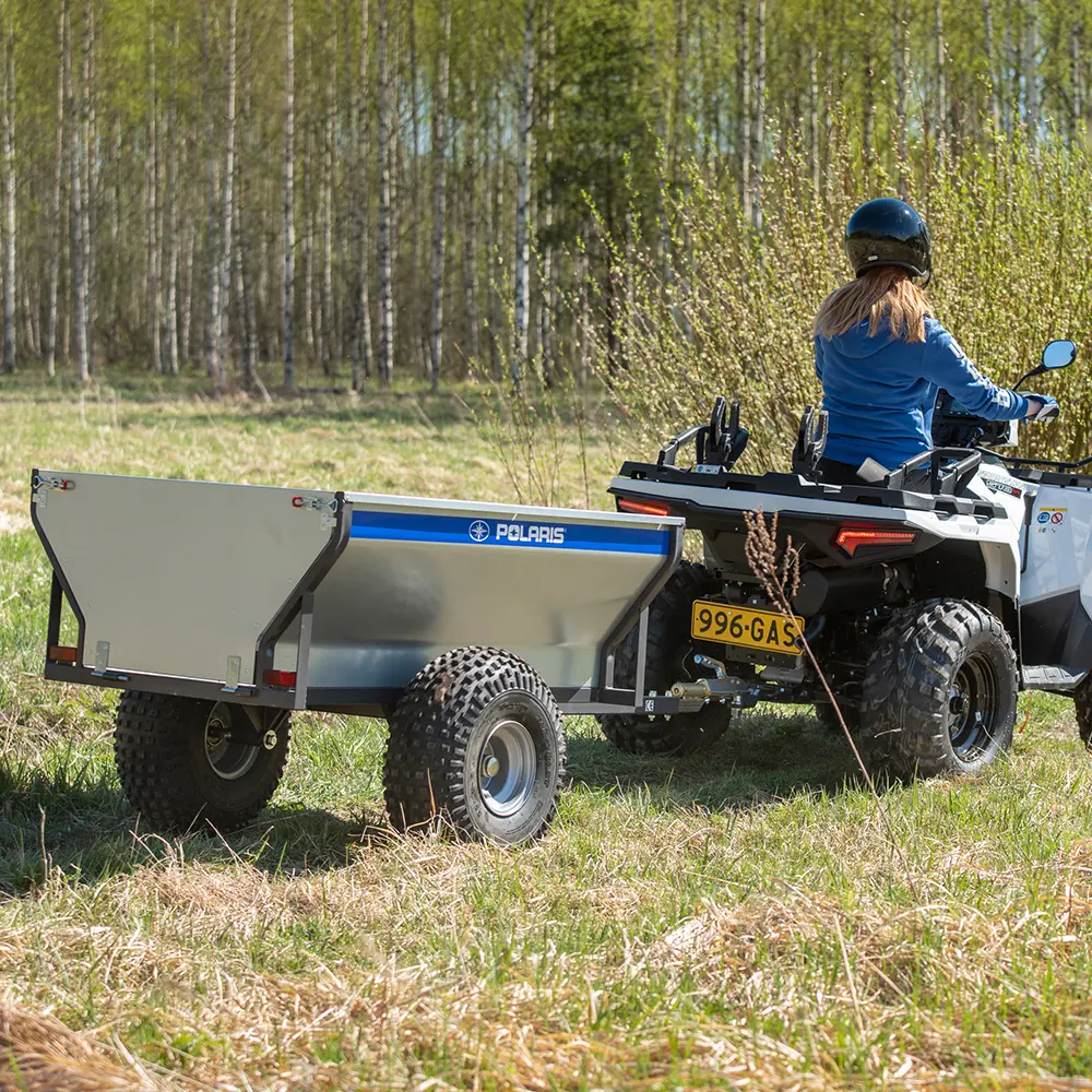 Tässä ATV-peräkärryssä on kippi sekä pyörivä vetopää joka auttaa kärryn vetämistä epätasaisessa maastossa.
