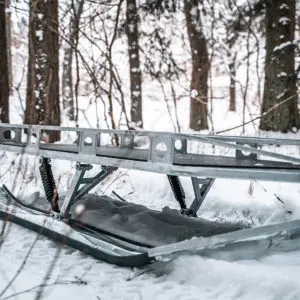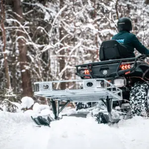 Platform dimensions 800 x 1850 mm ( 31,5 x 73 in ).Runner skis dimensions 200 x 1750 mm ( 7,8 x 68,9 in ).Plywood platform ground clearance 380 mm ( 14,9 in ).Shock absorbers for skis.Equipped with ball type 50 mm ( 2′ ) hitch coupling to use with the ATV / UTV.Equipped with 25mm / 1′ inner diameter eyelet for pin type hitch to use with snowmobile and small tractors.Both types of hitch couplings are supplied with the product.