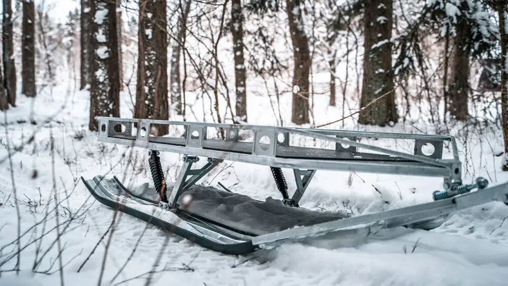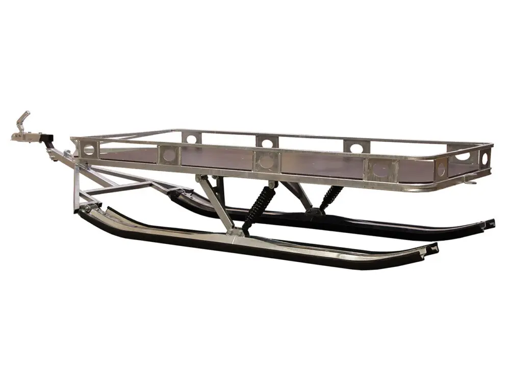 Platform dimensions 800 x 1850 mm ( 31,5 x 73 in ).Runner skis dimensions 200 x 1750 mm ( 7,8 x 68,9 in ).Plywood platform ground clearance 380 mm ( 14,9 in ).Shock absorbers for skis.Equipped with ball type 50 mm ( 2′ ) hitch coupling to use with the ATV / UTV.Equipped with 25mm / 1′ inner diameter eyelet for pin type hitch to use with snowmobile and small tractors.Both types of hitch couplings are supplied with the product.