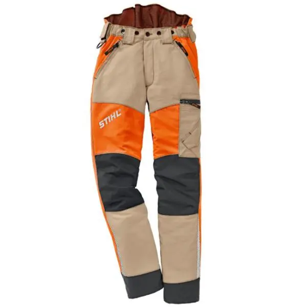 Viiltosuojamalli A. Sisäänrakennettu viiltosuojaus EN 381 mukaisesti. Malli A. Viiltosuoja-alue on merkitty kuvaan punaisella. Alue kattaa kaikkein vahingoille alttiimmat paikat ja menee hieman niiden yli myös housujen taakse.