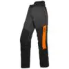 Viiltosuoja-alue, Malli A. Suojausalue EN 381 mukaisesti. Malli A. Punaiset merkinnät osoittavat, missä viiltosuoja-alueet ovat. Kaikkein vaaralle alttiimpia alueita on jatkettu jalkojen taakse.