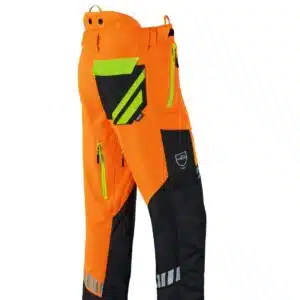 Housuissa on vankka, vedenpitävä ja hengittävä piikkisuoja ja hankaussuoja polven ja alaraajan yli. Housujen helmassa oleva joustava joustava nauha, jossa on koukut, mahdollistaa housujen kiinnittämisen tukevasti kenkään, jotta sahanpuru ei pääse sääriosiin ja jotta housujen lahkeet eivät pääse liukumaan ylöspäin.
