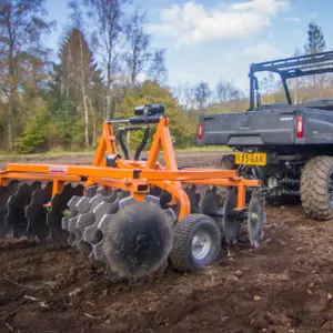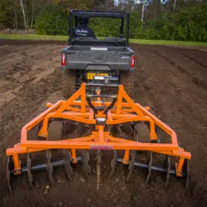 18 adjustable hitch height positions.425mm diameter notched disks on 4 gangs.Easy adjust turnbuckle for depth control.Oscillating beam axles with 15 x 6.00 – 6′ tires for excellent floatation.5 disk angle positions for cutting and mixing the soil (standard position at 18 degrees, -adjustable from 10 to 23 degrees.Optional 12 Volt Mini Motion package lifts and lowers the tandem disc without you leaving the seat.Manual lift kit (14.10400) included (only for products supplied by Iron Baltic ).
